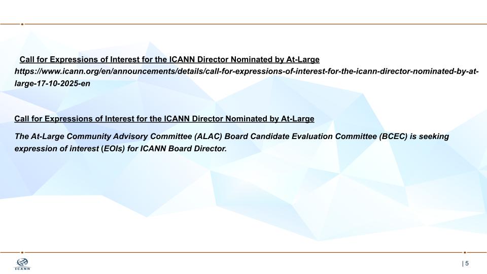 The At-Large Advisory Committee participates in many activities leading to it issuing including statements, comments, correspondences, proposals, briefings, declarations and formal advice on ICANN policies and issues impacting Internet users.